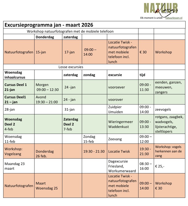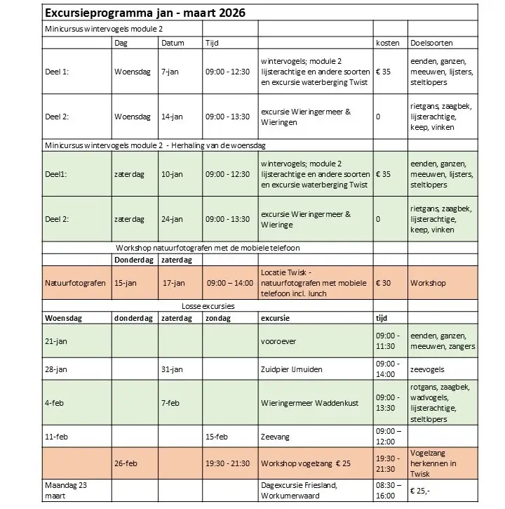 Het programma gaat van start met een minicursus, zodat je vogels nog beter leert herkennen. Daarna volgen losse excursies. De cursus bestaat uit twee dagdelen: